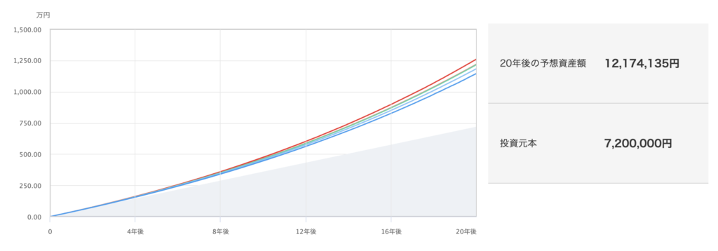 今はNISAで積立設定をしてしまえば、あとは放置でOKという環境を作ることができます。下のグラフは毎月3万円を年利5%で積立投資した場合の20年後のシミュレーションです。