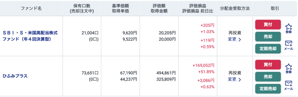 現在の保有銘柄はこんな感じで、SBIのSCHD(上の商品)はVポイントが余っていたのでマイルに交換しなかった分を投資してみた結果がこんな感じでした。