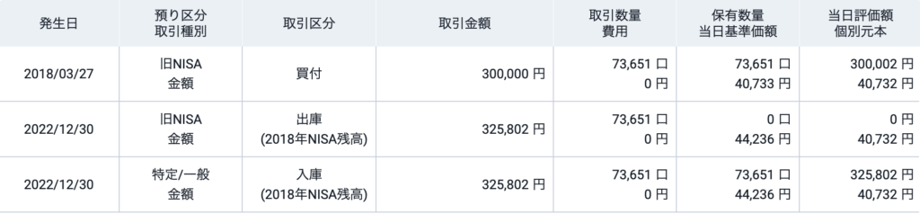 以前はSBI証券でNISA口座(一般NISA)を開設しており、その時に買ったものが、非課税期間が終了して5年後の年末に特定口座に移管された動きがよくわかりますね。