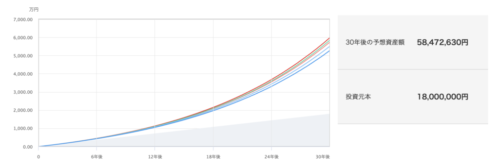 毎月5万円の積立を30年間継続すると、リターン7%の想定で元本1,800万円が5,800万円程度になる期待があります。