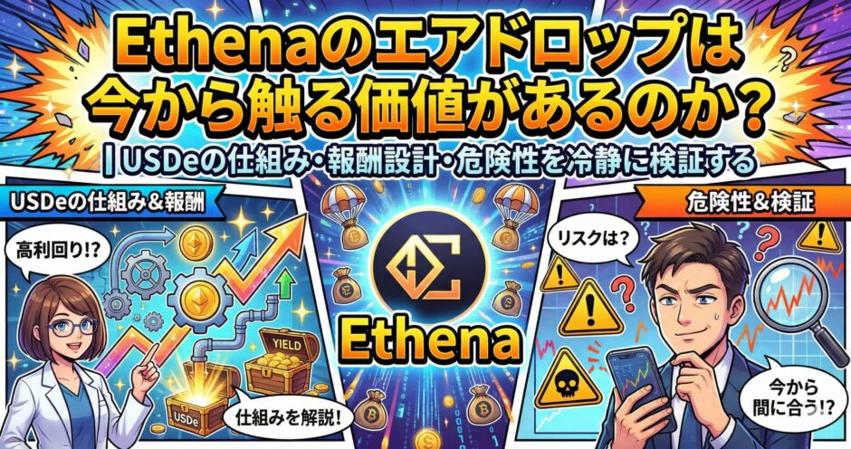 ただしEthenaは、見た目がシンプルでも中身は先物ヘッジを含む複合構造です。「もらえるかどうか」以前に、触る意味とリスクを理解しないと危険になりやすい領域でもあります。